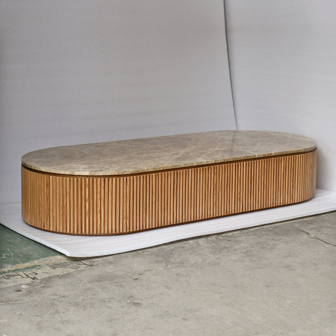 Orion combine générosité des proportions et sophistication des matières. Une table basse idéale pour les espaces de vie raffinés, où le mobilier devient architecture intérieure.