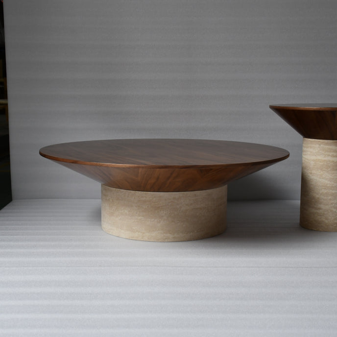 Solaris Duo marie l'intensité minérale du travertin à la chaleur noble du bois de noyer. Deux tables aux dimensions complémentaires qui se répondent avec harmonie : réunies au centre pour un impact visuel fort, ou séparées pour structurer subtilement l'espace. Le contraste des matières crée une présence raffinée et polyvalente.