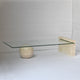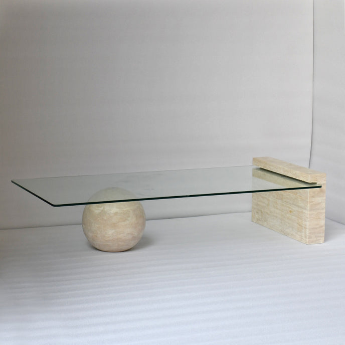 Sophistiquée et architecturale, la table basse Vetra associe la douceur minérale du travertin à la transparence du verre.